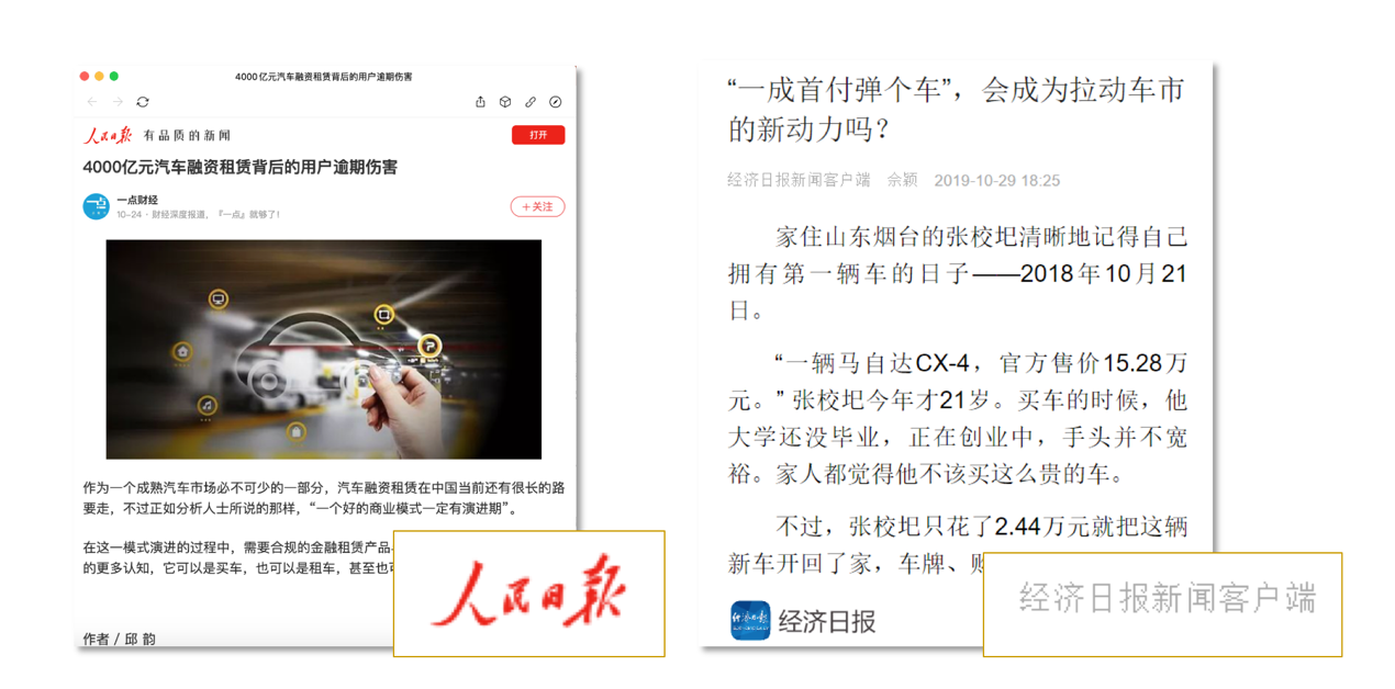 當(dāng)期,國內(nèi)汽車消費市場銷售連續(xù)2年下滑,進入深度調(diào)整期。而憑借“1成首付”大幅拉低汽車消費門檻的汽車融資租賃,已經(jīng)成為當(dāng)前激發(fā)汽車長尾消費的重要工具。但這一新興模式在推廣過程中依然遭遇阻力,部分消費者對這一模式存在質(zhì)疑,甚至將其稱之為“陷阱”。近日,包括中國新聞網(wǎng)、人民日報網(wǎng)、人民網(wǎng)(603000,股吧)、環(huán)球網(wǎng)、央廣網(wǎng)在內(nèi)的中央級媒體相繼針對該問題做出相關(guān)報道,引導(dǎo)市場正確認(rèn)識其概念,了解這種購車模式拉動“下車市場”年輕人潛在汽車消費的價值。